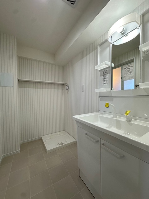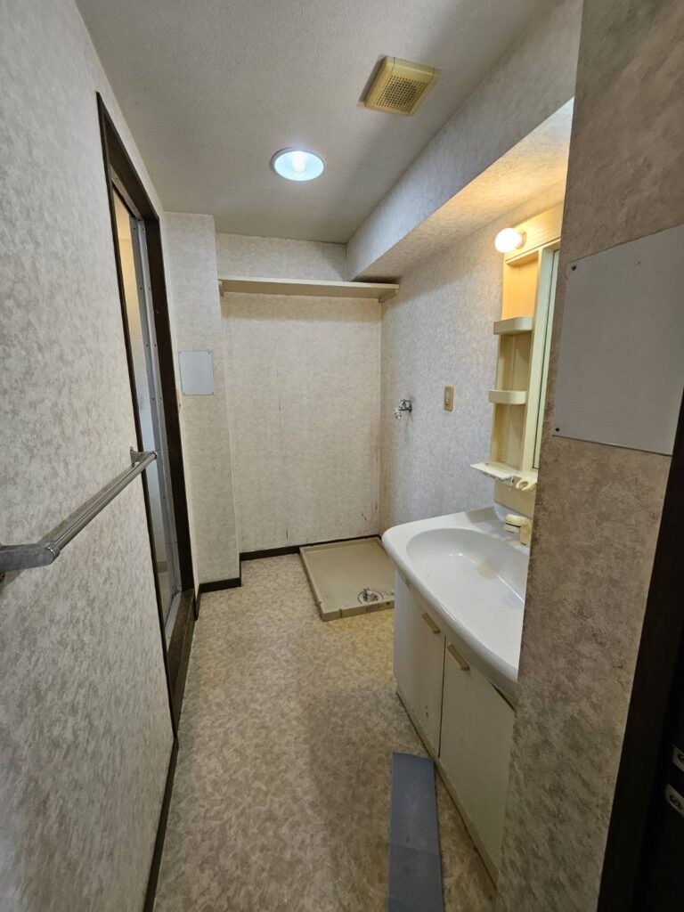 施工後の洗面所です。 洗面台、洗濯パンも新調しクロスや床も工事をしております!